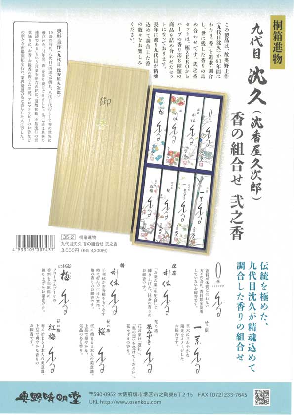 桐箱進物 九代目沈久 香の組合せ 弐之香 3,000円(税込3,300円)