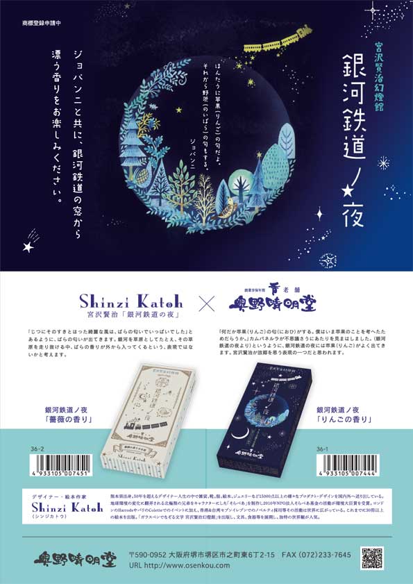 この度、デザイナー・絵本作家のShinzi Katoh氏と奥野晴明堂とのコラボレーションによる新製品「銀河鉄道ノ夜」薔薇の香り、りんごの香りの2種を発売開始致しました。宮沢賢治「銀河鉄道の夜」より着想を得た二種類の香り、ジョバンニと共に銀河鉄道の窓より漂う香りをお楽しみ下さい。